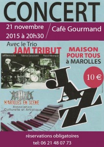 A partir de 20h30, venez vous faire plaisir en écoutant le concert de jazz joué par l'excellent trio JAM TRIBUT. Pour également régaler vos papilles, nous vous servirons un délicieux café gourmand. Réservation obligatoire au 06 21 48 07 73 avant le 20 novembre 2015.