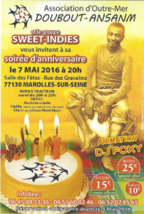 Réservation obligatoire avant le 3 mai 2016 (06 45 88 33 36 ou 06 51 60 02 46 ou 06 52 07 85 65) Repas traiteur servi de 20h à 23h Menu : Assiette créole Paëlla (avec ou sans fruits de mer) Glace ou gâteau Mont Blanc Zouker : 15€ avec 1 conso offerte Repas
