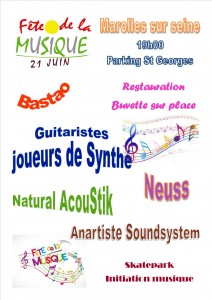 Le groupe de percussions brésiliennes de rue "Bastao"démarrera sa prestation à 18 heures rue des fermes et vous entraiera, par la grande rue, jusqu'au parking St-Georges. A 19 heures,les jeunes guitaristes et joueurs de synthé de l'association "Marolles en scène" vous interpréteront avec brio des succès musicaux. Ils seront suivis de 3 groupes de jeunes avec