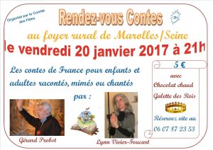Gérard Probst et Lynn Vivier-Foucart nous racontent les histoires des différentes régions de France. Tour à tour, drôles, gais, comédiens, ils nous transportent dans notre passé pour notre plus grand bonheur. Après 2 heures de récits et chansons, nous partagerons un chocolat chaud et une part de galette des rois. Venez nombreux partager ce moment