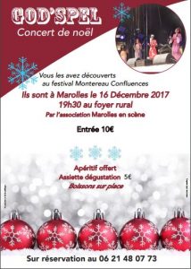 Venez nombreux écouter ce concert de Noël GOD'SPEL. Apéritif offert Possibilité d'une assiette dégustation à 5€